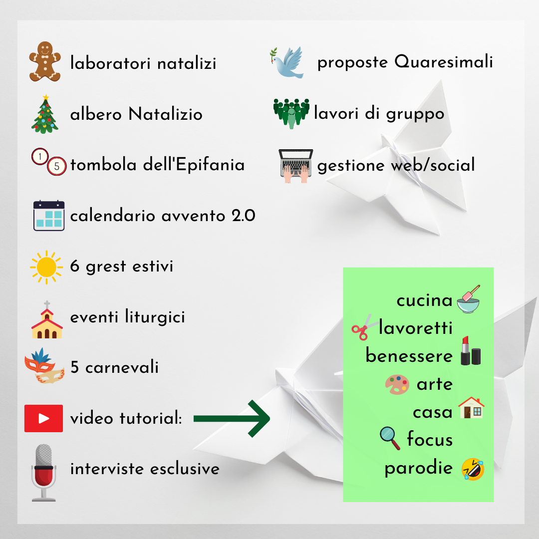 Questo gruppo si occupa inoltre di tutta la parte tecnologica e social di questa parrocchia e proprio per questo vi invitiamo a seguire la nostra pagina instagram dove pubblichiamo tante iniziative e teniamo aggiornate le persone sul nostro sviluppo. E qua sotto vi lasciamo inoltre dei video delle foto e l'elenco di tutte le attività che abbiamo realizzato.